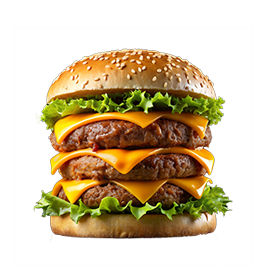 3 Steaks de boeuf smashés, cheddar, salade, oignons rouges, sauce au choix.